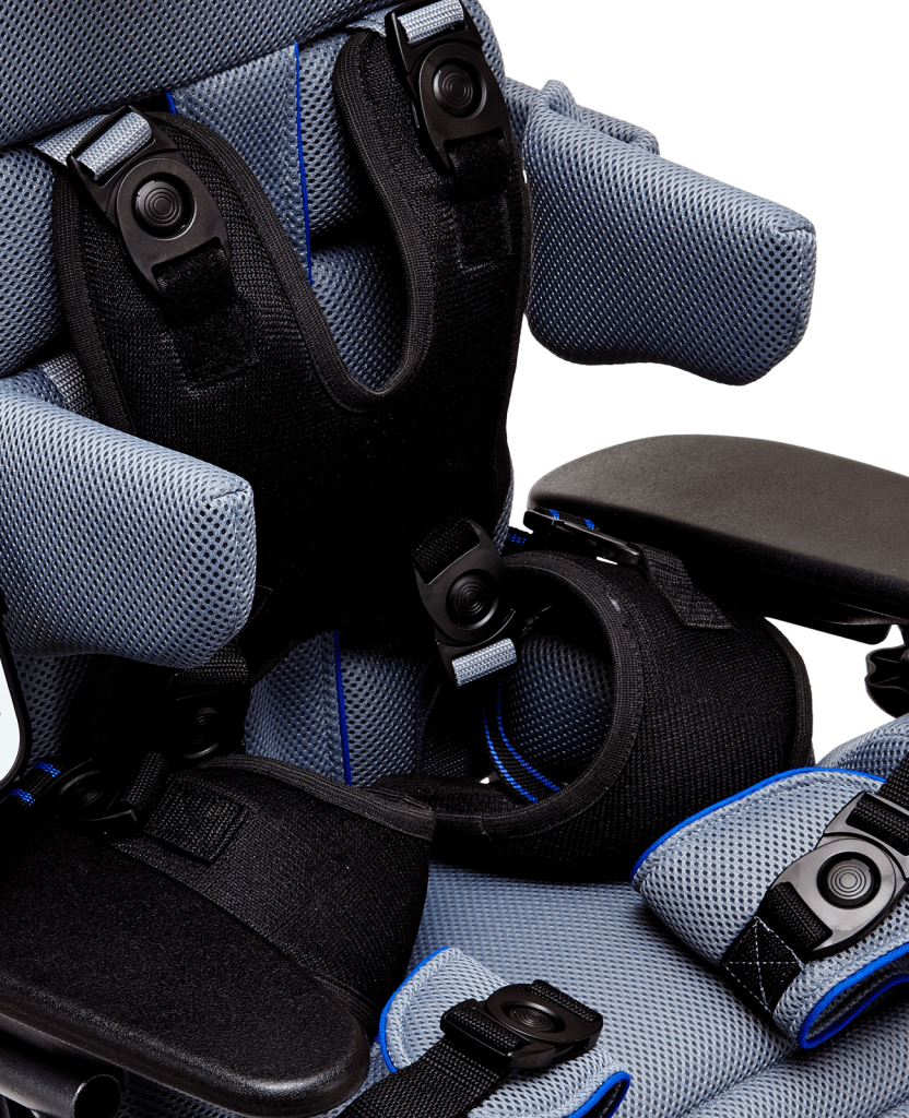 - Adjustable pads and supports allow for accommodation/correction of asymmetries – trunk laterals, hip and pelvic supports, thigh support straps, chest strap, knee blocks, and moldable headrest provide full support in both standing and sitting.